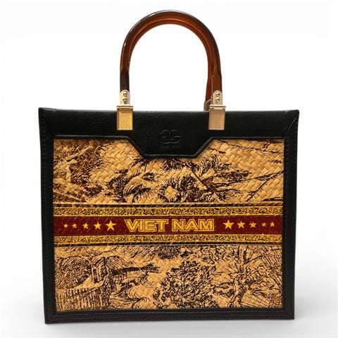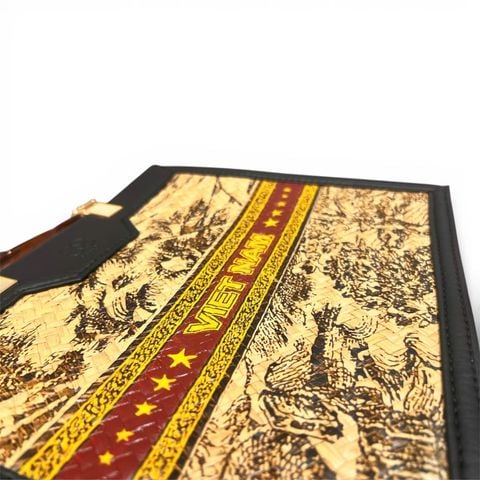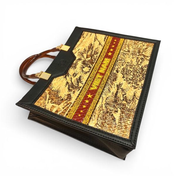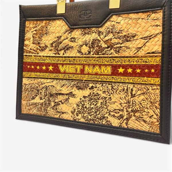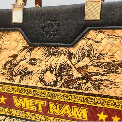 Trung tâm mặt túi nổi bật với dòng chữ “VIET NAM”, được nhấn bằng tông màu đỏ – vàng, gợi liên tưởng đến màu cờ Tổ quốc, biểu trưng cho: